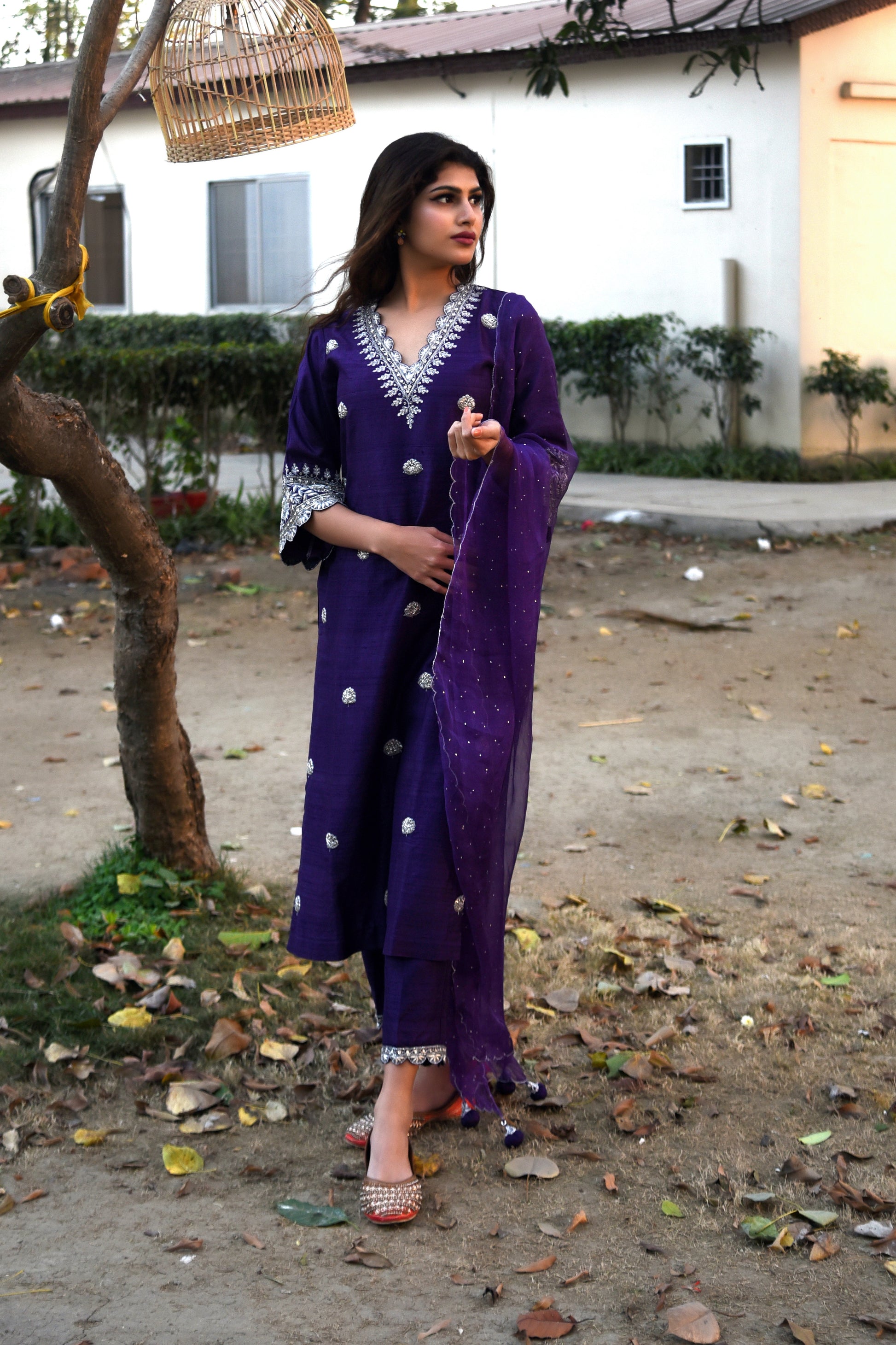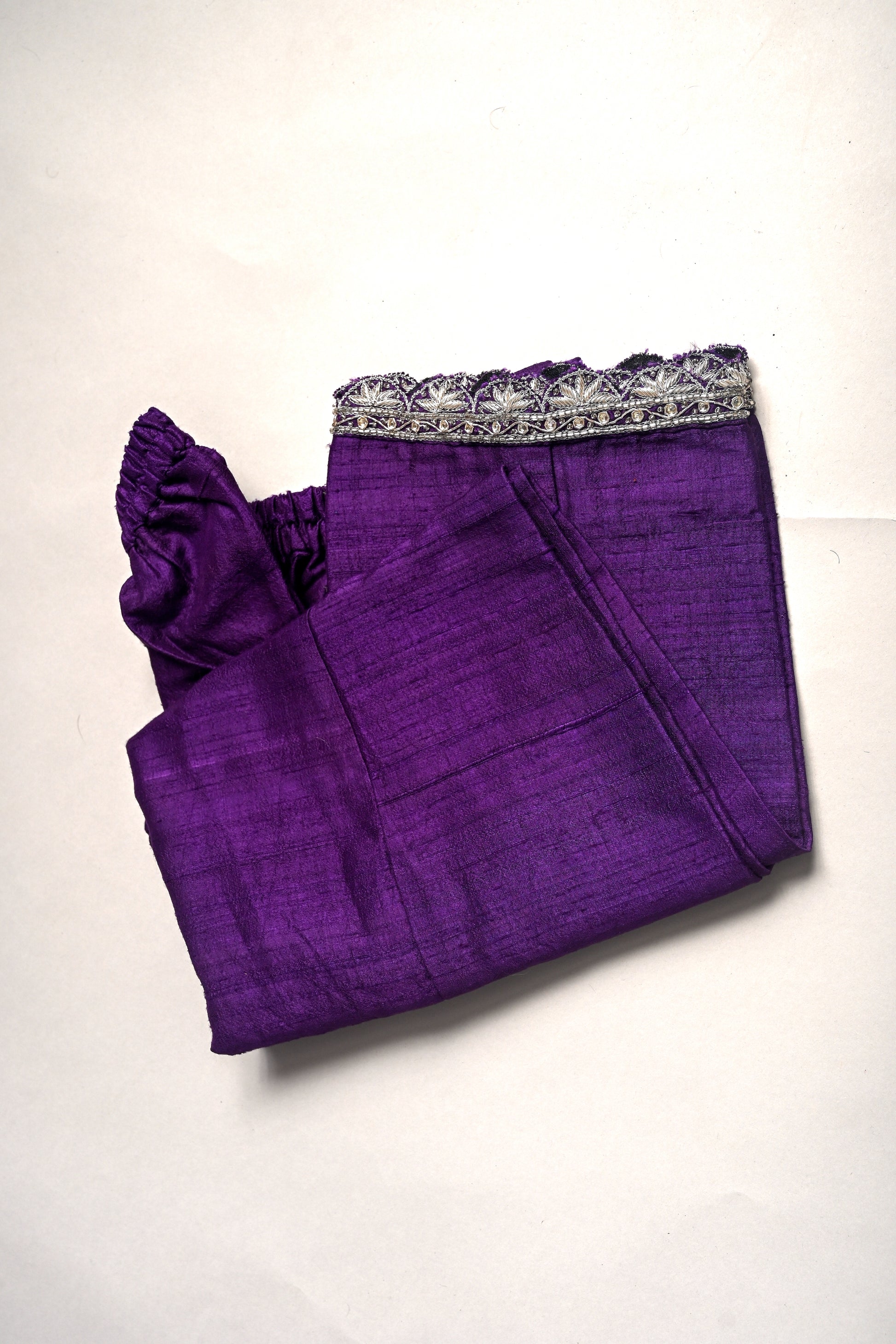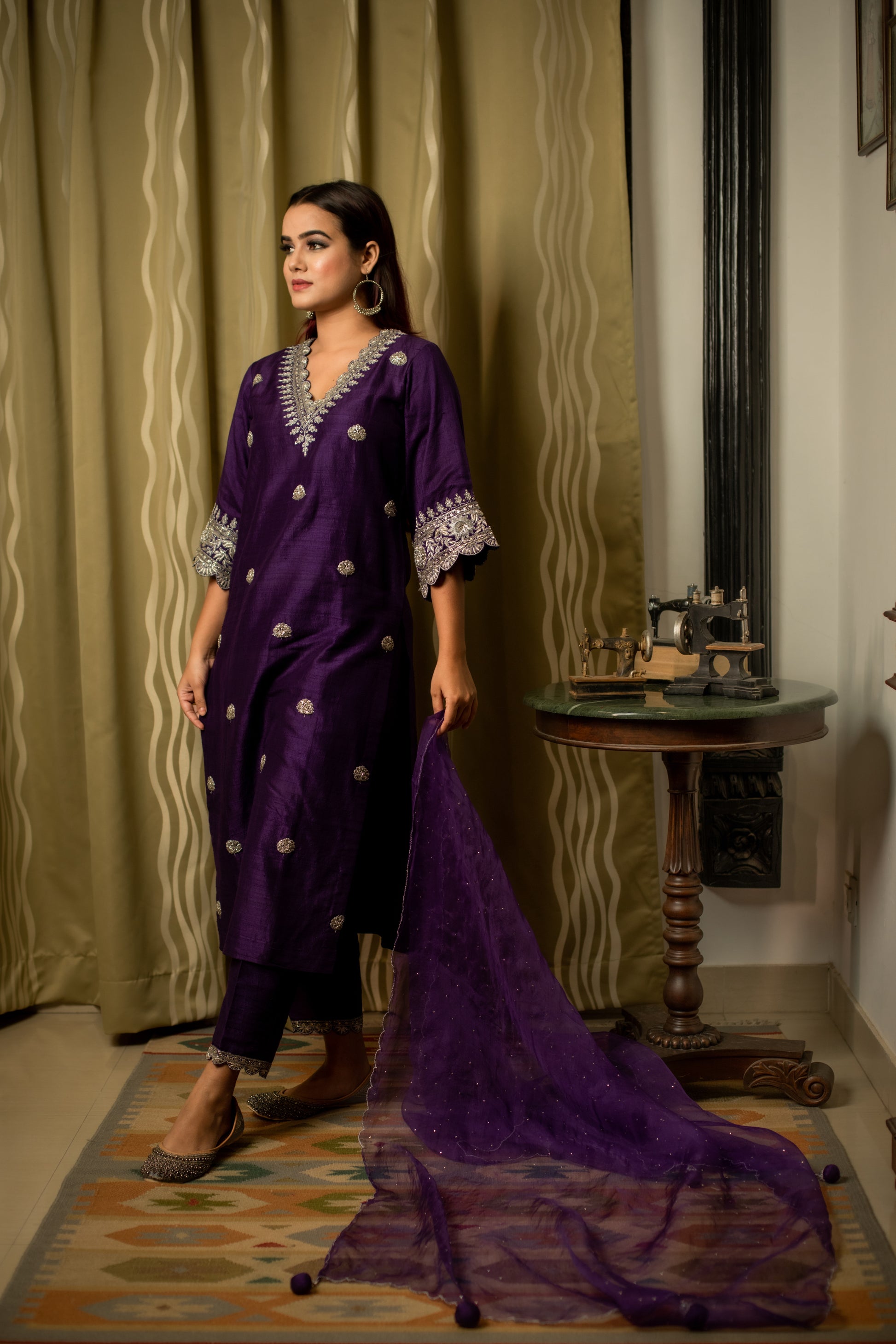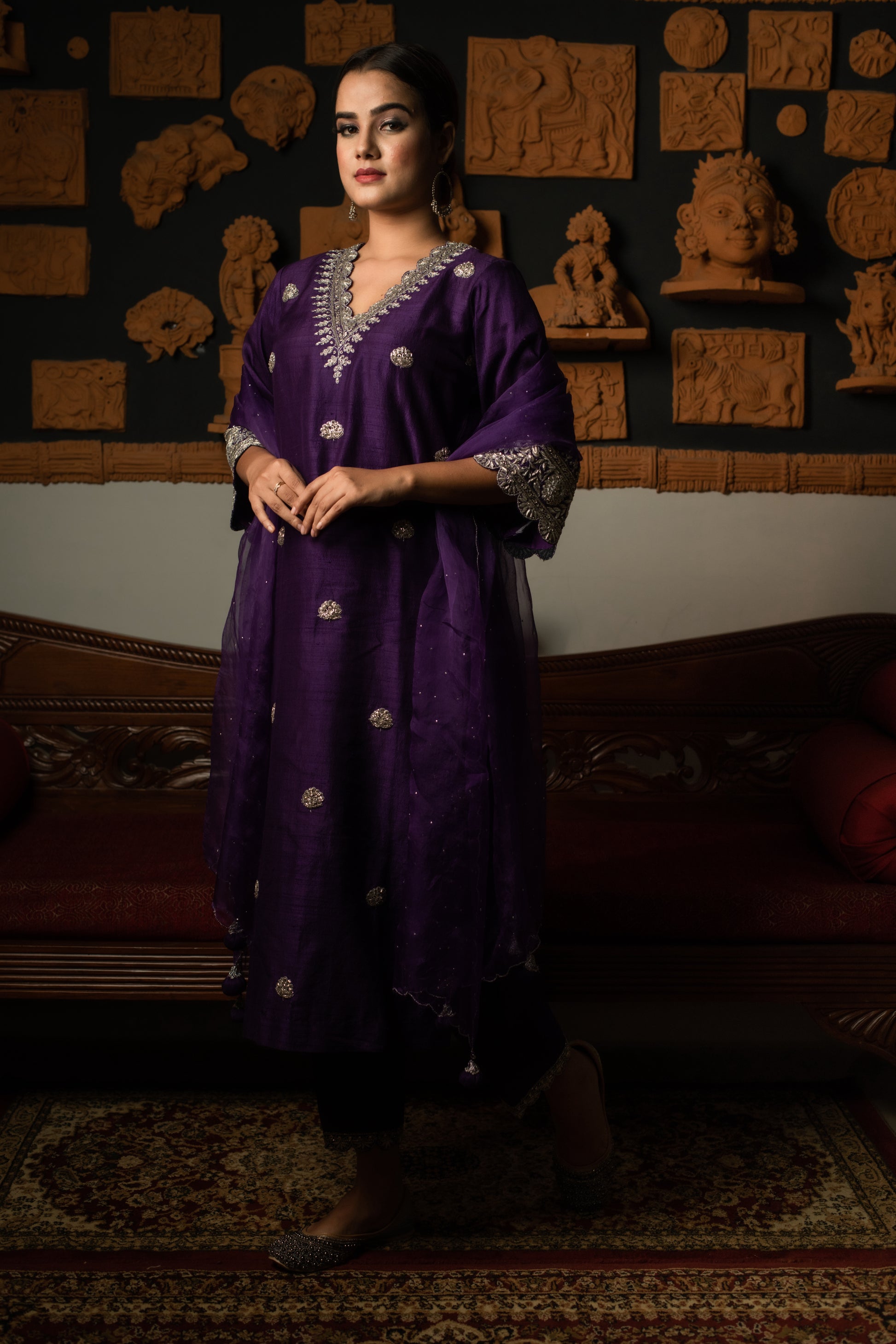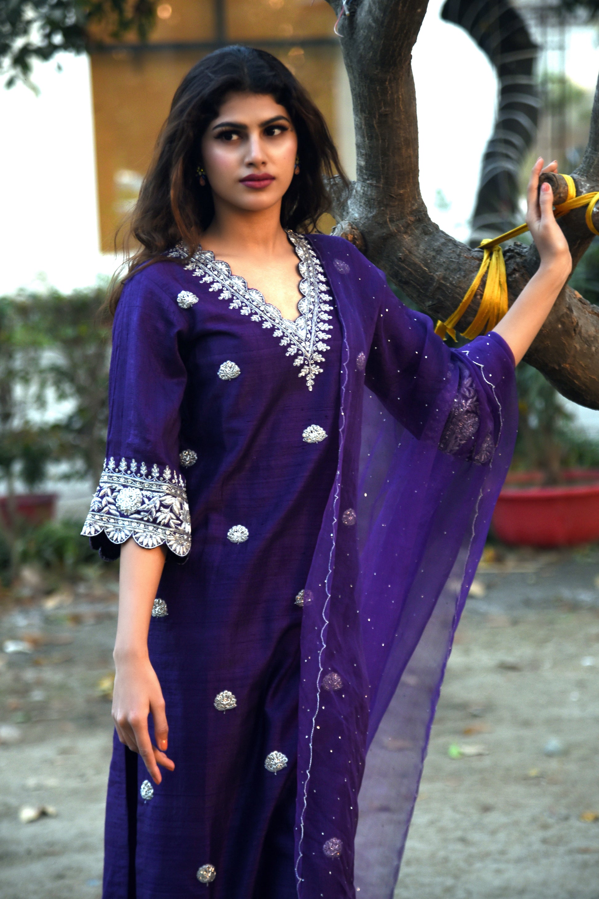 Royal Silver Zardozi Hand Embroidered Silk Kurti Set