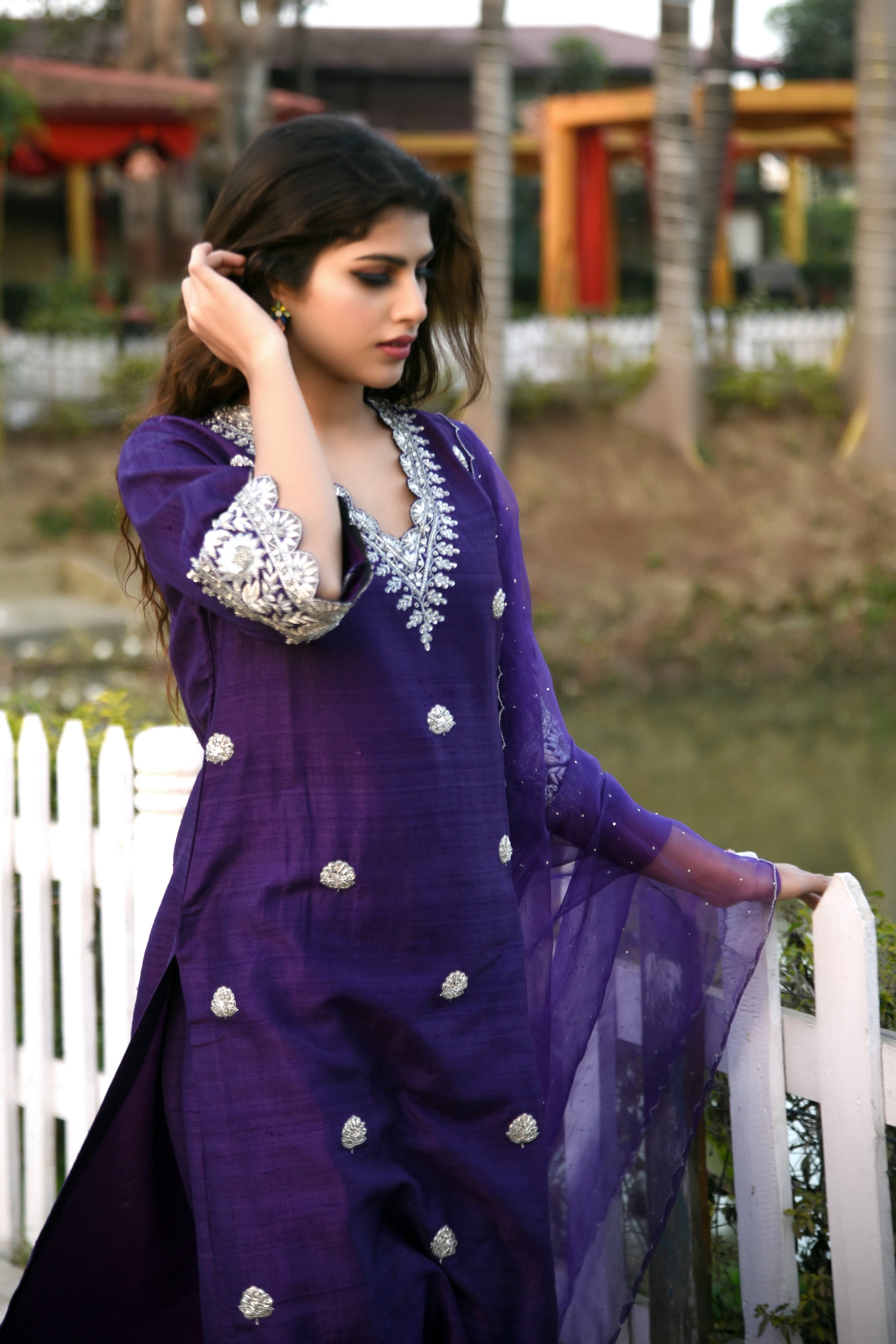 Hand Embroidered Silk Kurti set in Silver Zardozi embroidery.