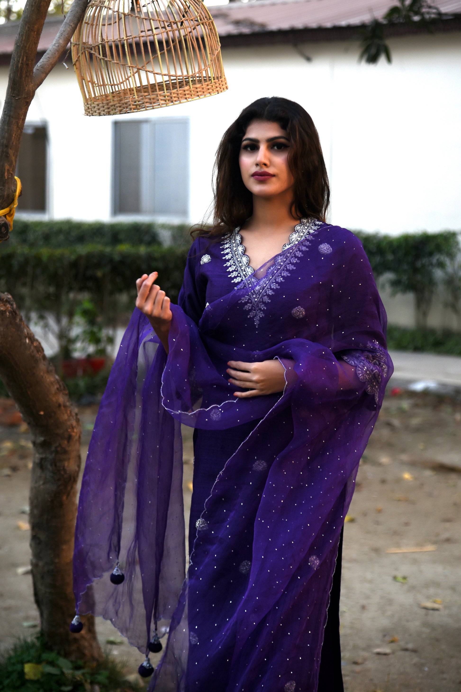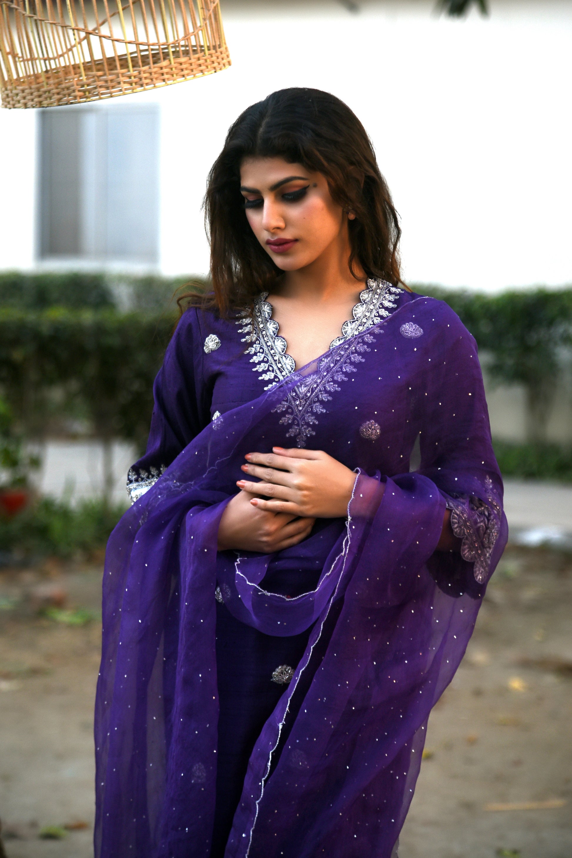 Paired with straight fit Silk Pants with scalloped embroidery border and Organza dupatta with Hand ‘Mukaish’ work and Zari scalloping.